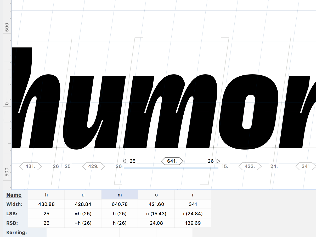 read about SpacingWant the O sidebearing to always be 60% of H? Link metrics and set up complex spacing relationships with our live math expressions engine. Bind the sidebearings and they will remain constant—even when you change the outline. New Easily copy expressions between masters.